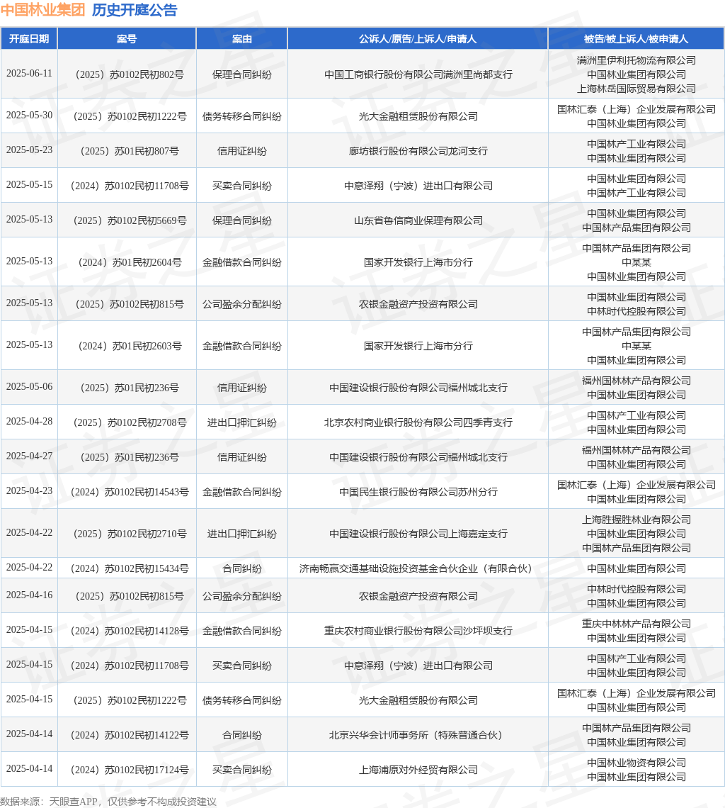案号:(2025)苏0102民初815号审理法院:南京市玄武区人民法院案由:公司盈余分配纠纷当事人信息: 原告/上诉人:农银金融资产投资有限公司 被告/被上诉人:中国林业集团有限公司、中林时代控股有限公司开庭日期:2025年5月13日根据统计,近一年内以中国林业集团有限公司为当事人的历史开庭公告有292则,其中案由为“金融借款合同纠纷”的公告以90则居首,其次为“信用证纠纷”有54则,“合同纠纷”有48则。历史开庭公告(前20条)如下: